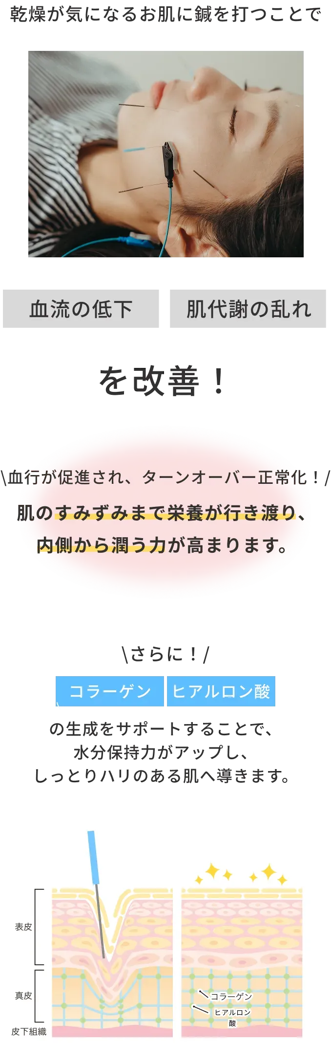 鍼でツボを刺激することで、細部まで血流が巡り、しっとり感を取り戻せます。