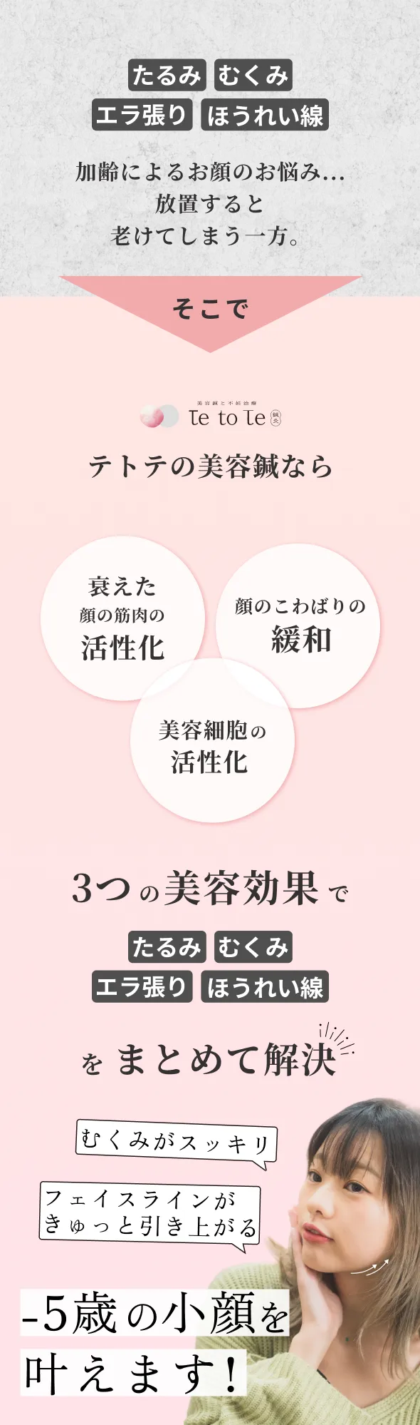 美容鍼では、加齢によって弱くなったフェイスラインの筋肉を、鍼と電気で刺激し動かすことでたるみを引き上げます!